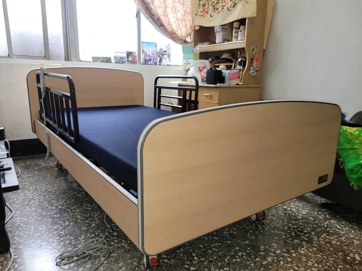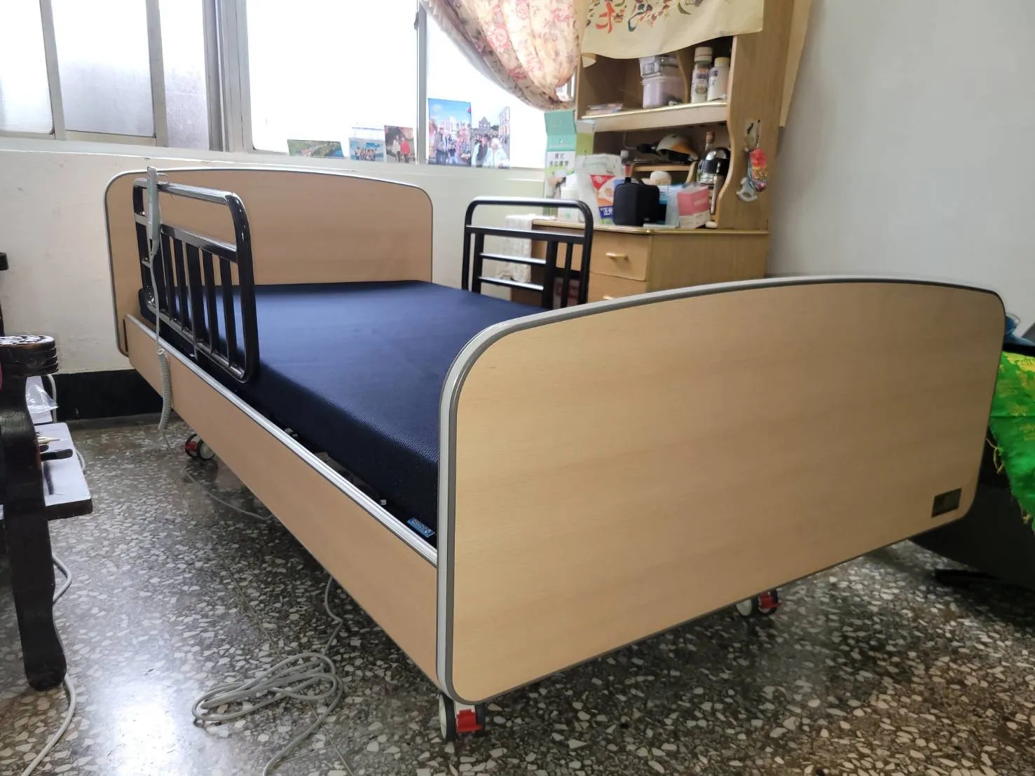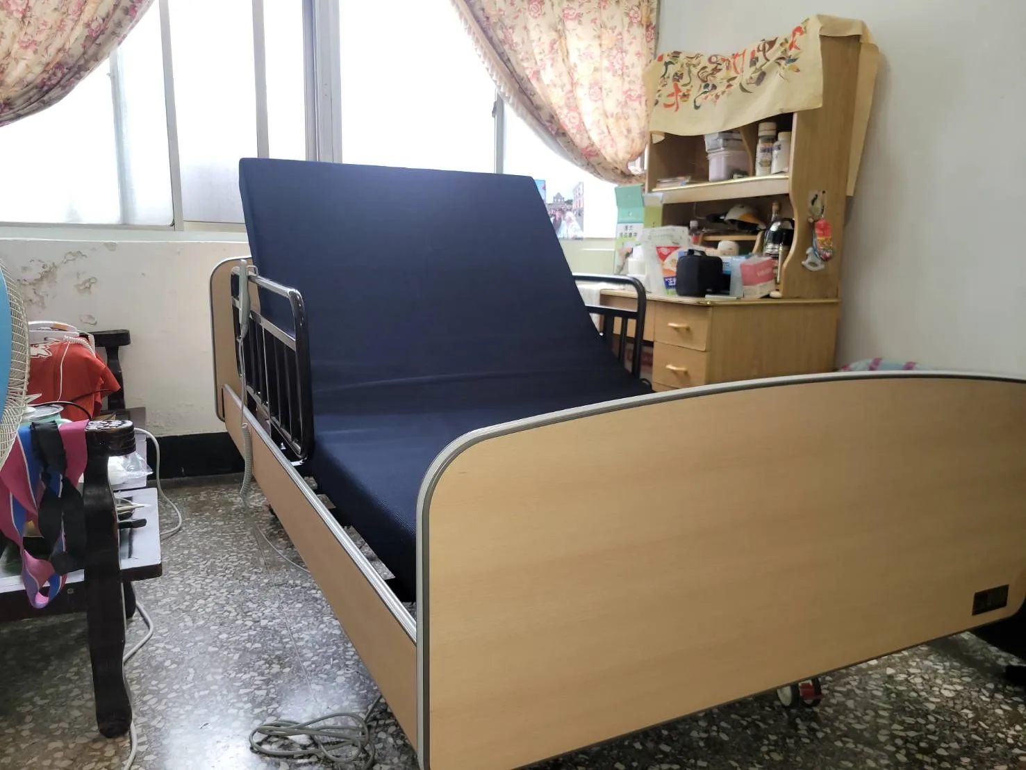 林阿嬤原有使用的床太高,坐在床沿時,雙腳無法踩到地板上,需要墊高。使用三馬達功能電動床,電動床可以垂直升降調整高度,雙腳即可踩地。